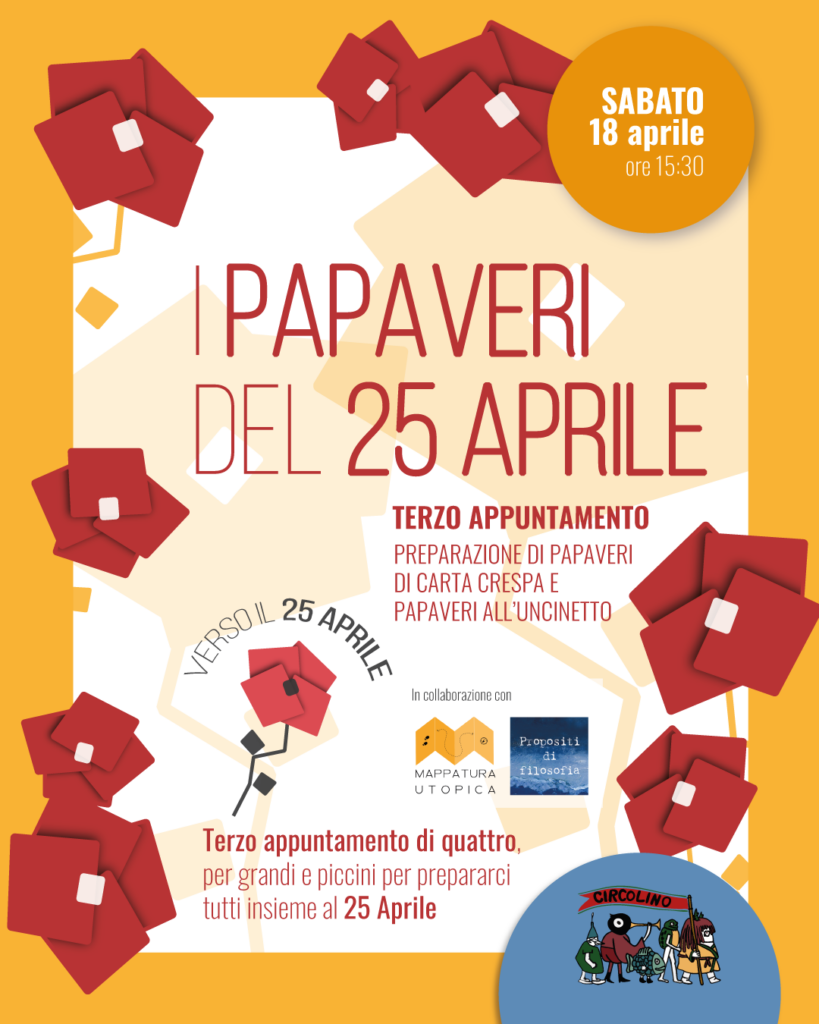 Sabato 18 aprile ore 15:30 I PAPAVERI DEL 25 APRILE Laboratorio per grandi e piccini Lə bimbə del Circolino produrranno...