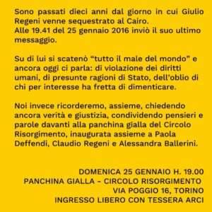 Noi invece ricorderemo, assieme, chiedendo ancora verità e giustizia, condividendo pensieri e parole davanti alla panchina gialla del Circolo Risorgimento, inaugurata assieme a Paola Deffendi, Claudio Regeni e Alessandra Ballerini.